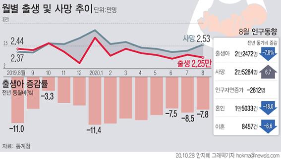 8월 인구 자연증가(출생아 수-사망자 수)는 -2812명으로 지난해 11월부터 10개월 연속 마이너스가 이어졌다. 이에 따라 올해 연간 기준으로도 인구 자연 감소가 유력해졌다.