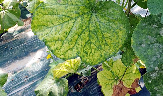 최근 전남지역 오이와 멜론에서 잎의 녹색이 퇴색해 연하고 노랗게 되는 증상이 발생했는 데 박과진딧물 매개 황화바이러스병과 박과퇴록 황화바이러스병에 의한 것으로 진단됐다.