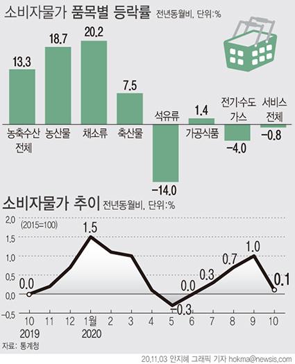 통계청이 3일 발표한 '10월 소비자물가동향'에 따르면 지난달 소비자물가지수는 105.61(2015=100)로 1년 전과 비교했을 때 0.1% 상승했다.