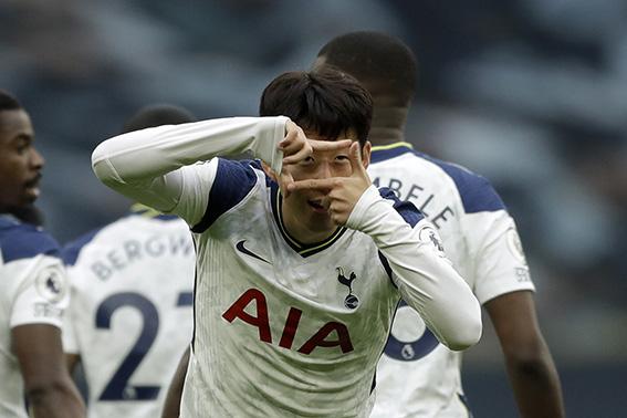 손흥민이 18일(현지시간) 영국 런던의 토트넘 홋스퍼 스타디움에서 열린 2020-21 시즌 프리미어리그(EPL) 5라운드 웨스트햄과 경기에 선발 출전해 선제골을 넣고 세리머니를 펼치고 있다.