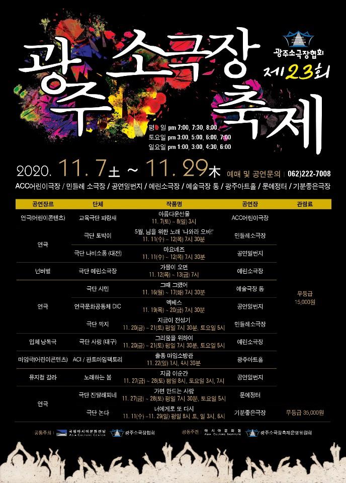 문화체육관광부 국립아시아문화전당(ACC)이 공동 주최하고 아시아문화원(ACI)이 공동 주관하는 제23회 광주소극장축제가 오는 7일부터 29일까지 ACC 어린이극장 등 광주지역 8개 소극장에서 열린다고 밝혔다.