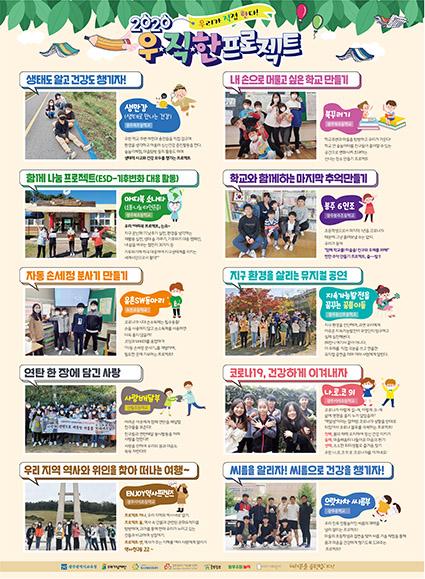 전통놀이인 씨름을 마을 후배들에게 알려주겠다는 광주중 프로젝트 ‘으랏차차 씨름부’, 최첨단기술과 결합된 자동손소독제를 만들어 여기저기 기부하겠다는 유촌초 프로젝트 ‘유촌SW동아리’, 기후변화 대응으로 지구생태계를 지켜 세계시민으로서 모범을 보이겠다는 광주북초 프로젝트 ‘아띠북 소나타’, 코로나19로 망쳐질 위기에 처한 초등학교 마지막 6학년 시절을 행복한 추억으로 바꾸겠다는 광주봉주초 프로젝트 ‘봉주 6인조’, 지역 소외된 이웃을 위해 연탄을 배달하는 산월초 프로젝트 ‘사랑배달부’, 광주지역 문화유적지 탐방을 통해 5?18민주화운동 등 역사가 주는 지혜를 사람들에게 알리겠다는 광주서석초 프로젝트 ‘ENJOY역사프렌즈’ 등이 뜨거운 반응을 얻고 있다.