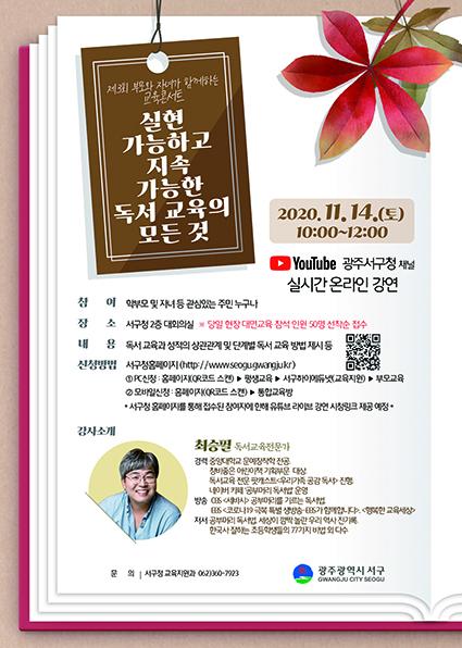 교육은 광주서구청 유튜브 채널을 통한 실시간 온라인 강연과 안전한 대면 교육을 병행하여 진행하며 참석 인원 50명을 선착순 접수한다.