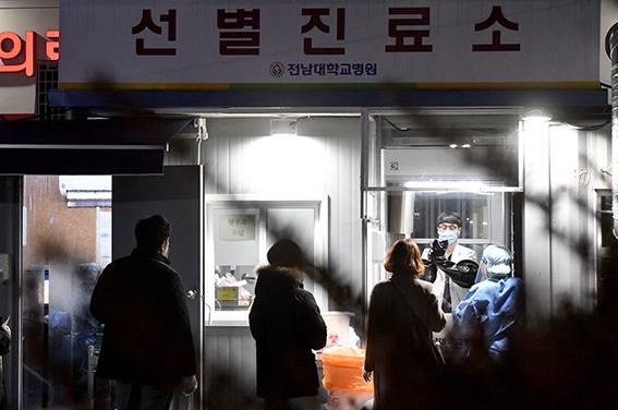 15일 오후 광주 동구 전남대학교병원 응급실 입구 선별진료소에서 의료진과 종사자들이 신종 코로나바이러스 감염증(코로나19) 검사를 받고 있다. 전남대병원에서는 의사와 환자 등 6명이 코로나19 확진 판정을 받았다.