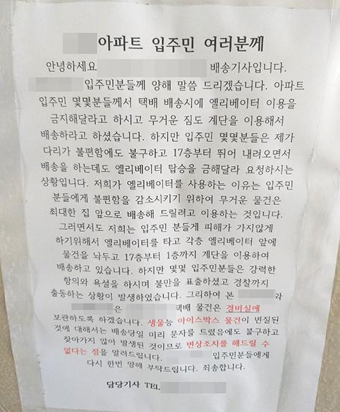 한 택배기사 몇몇 아파트 입주민들이 승강기 사용을 금지 시키자 게시한 입장문. (사진=독자 제공)