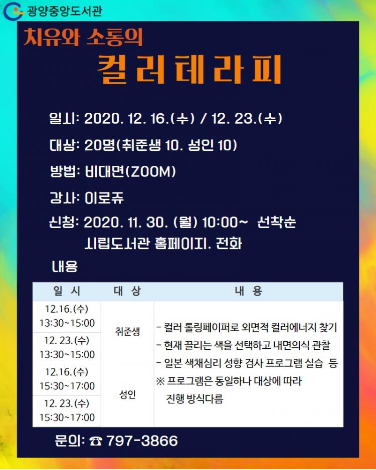 고근성 도서관운영과장은 “프로그램은 코로나19 예방수칙에 따라 비대면(ZOOM)으로 진행되며, 강사와 수강생 개개인 간의 원활한 의사소통을 위해 수강생 수를 제한해 운영한다”며, “수강생들이 이번 컬러테라피 과정을 통해 코로나19로 인한 불안감을 해소하길 바란다”고 말했다. /광양=조순익 기자