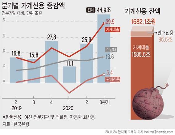 한국은행이 24일 발표한 '3/4분기중 가계신용(잠정)'에 따르면 3분기 가계신용 잔액은 전분기대비 44조9000억원(2.7%) 늘어난 1682조1000억원을 나타냈다. 이는 한은이 관련 통계를 집계한 2002년 4분기 이후 역대 최대치다. 증가 규모는 지난 2016년 4분기(46조1000억원) 이후 역대 두번째로 컸다. 역대 3분기 중에서는 최대치였다. 전년동기대비로도 109조6000억원(7.0%) 늘어 2016년4분기(139조4000억원) 이후 가장 많았다.