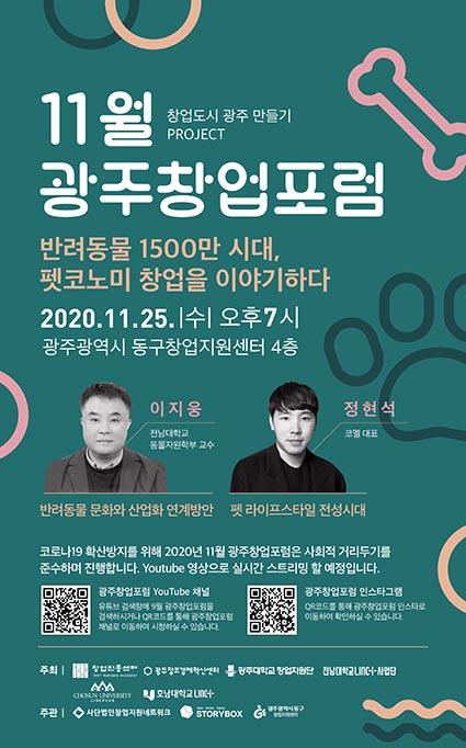 '11월 광주창업포럼’이 오는 25일 오후 7시에 개최된다. 이번 포럼에서는 “반려동물 1500만 시대, 펫코노미 창업을 이야기하다”를 주제로 최근 급속한 성장세를 보이며 미래 주요 시장의 한 축으로 자리잡게 된 반려동물과 관련 산업에 대해 이야기를 나눈다.