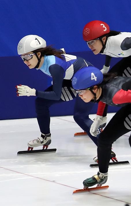 26일 의정부 실내빙상장에서 열린 제37회 전국남녀 쇼트트랙스피드스케이팅 대회 여자 일반부 1500M 결승 경기, 성남시청 최민정(흰색 모자), 서울시청 심석희(파란 모자), 고양시청 김아랑(빨간 모자) 등 선수들이 역주하고 있다.