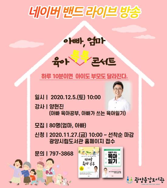 광양용강도서관은 오는 5일 코로나19 시대에 육아로 지친 부모를 위해 육아 전문가를 초청해 ‘아빠, 엄마 육아 톡톡 콘서트’를 연다고 밝혔다.