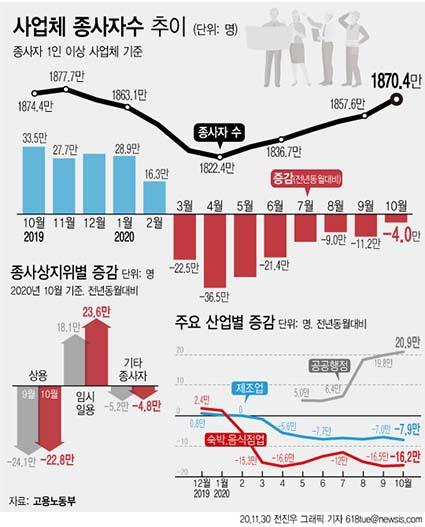 고용부는 아울러 10월 중 사회적 거리두기 완화 조치 등의 영향으로 감소폭이 축소됐다고 분석했다. 그러나 코로나19에 직격탄을 맞은 '거리두기 업종' 숙박·음식업 종사자는 지난달 16만2000명(12.6%) 감소해 어려움은 여전했다.