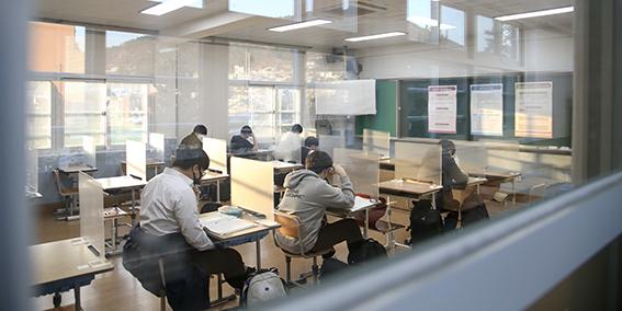코로나19 확진 판정을 받은 2명은 목포시의료원과 순천시의료원에 설치된 병원시험장에서, 자가격리 수험생 3명은 목포 지역 별도시험장에서 각각 시험을 치르고 있다.