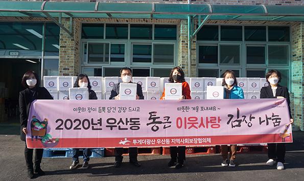 광산구 우산동지역사회보장협의체가 2일 돌봄 이웃 331가구에 1,000만원 상당의 김장김치 1,655kg을 택배로 전달했다.