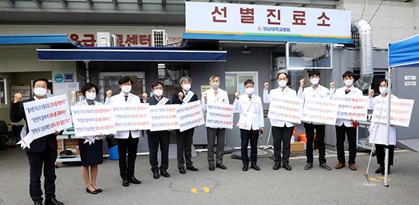 전남대학교병원 안영근 신임 병원장과 보직자들이 7일 오전 광주 동구 전남대병원 응급실 앞에서 코로나19 개인 위생 준수 캠페인을 벌이고 있다. (사진=전남대병원 제공).