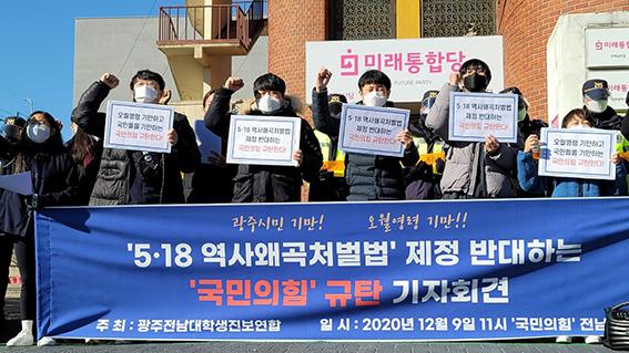 광주전남대학생진보연합은 이날 오전 광주 북구 국민의힘 당사 앞에서 기자회견을 열고 "국민의힘이 광주 시민과 오월 영령들을 기만하고 있다"며 규탄했다.