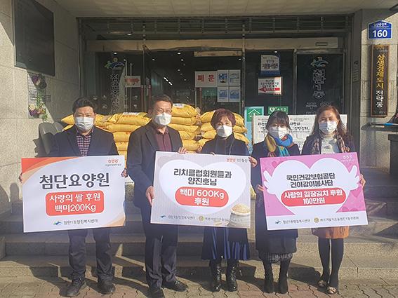 10일 봉사단체 리치클럽(회장 양진호) 회원, 노미자 첨단요양원장이 각각 쌀 600kg과 200kg을, 국민건강보험공단 건이강이봉사단이 100만원 상당 김장김치를 연말연시 돌봄 이웃에게 나눠달라며 광산구 첨단1동 행정복지센터에 맡겼다.