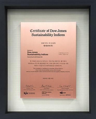 한전KPS가 12년 연속 'DJSI Korea' 최우수기업에 편입됐다. 사진은 미국 다우존스와 지속가능 경영평가 전문기관인 스위스 로베코샘(Robeco SAM)이 발행한 인증서. (사진=한전KPS 제공)