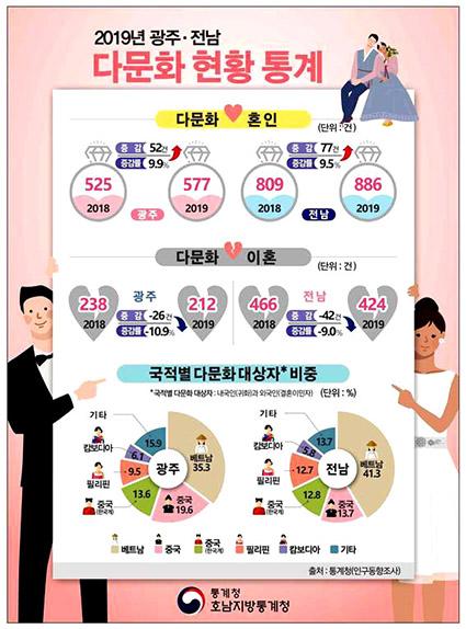 지난해 다문화 가구 혼인은 광주 577건으로 전년 대비 9.9% 늘었고 전남은 886건으로 9.5% 증가했다.
