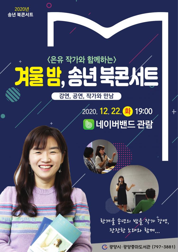 광양중마도서관이 연말을 맞아 오는 22일 저녁 7시 시민들을 대상으로 ‘겨울 밤, 송년 북콘서트’를 네이버밴드에서 라이브방송으로 진행한다고 밝혔다.