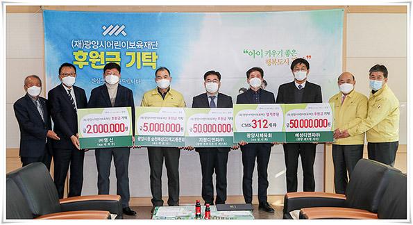 어린이보육재단은 지난 21일 시청 접견실에서 두차레로 나누어 각각 정현복 광양시장과 황재우 이사장, 기탁자 등 10여 명이 참석한 가운데, 후원금 기탁식을 가졌다.
