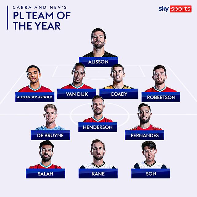 스카이스포츠는 22일(한국시간) 전문 패널인 리버풀 전설 제이미 캐러거와 맨체스터 유나이티드(맨유) 레전드 게리 네빌이 선정한 EPL 올해의 팀을 공개했다.