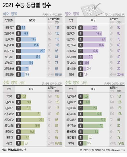 올해 1등급과 2등급을 구분하는 표준점수는 국어 영역이 131점이었다. 자연계열 수학 가형은 130점, 인문계열 수학 나형은 131점이었다. 원점수 만점자가 받을 표준점수 최고점은 국어 144점, 수학 가형과 나형이 각각 137점이었다.