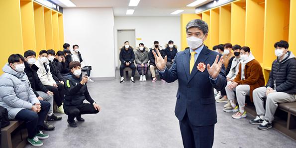 프로축구 광주FC 김호영 신임감독이 23일 오후 광주 서구 광주축구전용구장 라커룸에서 선수들과 첫 인사를 하고 있다.