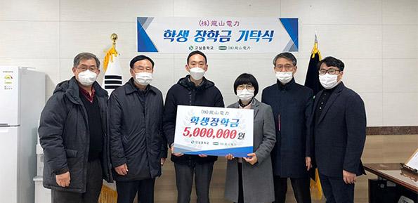 ㈜용산전력 송환기 회장은 “어려운 학생들에게 조금이나마 도움을 주고 싶어 이번 장학금을 기부하게 됐다”며 “앞으로도 사정이 허락된다면 매년 기부활동을 어어 가고 싶다”고 밝혔다.