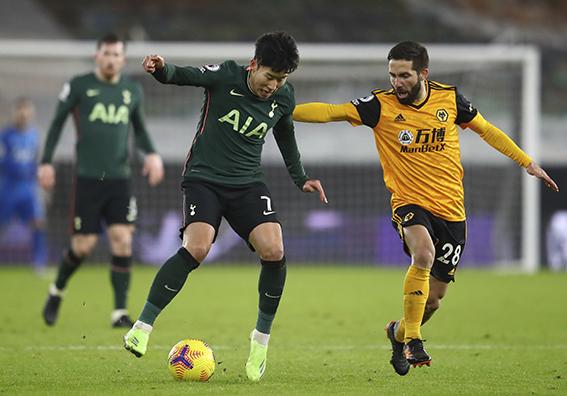 토트넘 손흥민이 27일(현지시간) 영국 울버햄프턴의 몰리뉴 스타디움에서 열린 2020~21 잉글랜드 프로축구 프리미어리그(EPL) 15라운드 울버햄프턴과의 경기에 선발 출전해 공을 다투고 있다. 손흥민은 공격 포인트를 올리지 못했고 토트넘은 1-1 무승부를 거두며 리그 5위를 기록하고 있다. 2020.12.28.