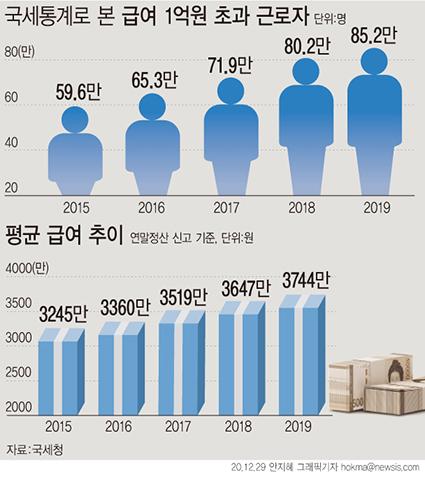 연간 총급여액이 1억원을 넘는 근로자는 85만2000명으로 전년(80만2000명) 대비 6.2% 증가했다. 전체의 4.4%다. 전년 대비 0.1% 증가했다. 연간 총급여액 1억원 초과자는 2015년 59만6000명(3.4%)→2016년 65만3000명(3.7%)→2017년 71만9000명(4.0%)→2018년 80만2000명(4.3%)→2019년 85만2000명(44%)으로 증가했다.