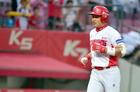 27일 오후 광주 북구 광주-기아챔피언스필드에서 열린 2019프로야구 KIA 타이거즈 대 삼성 라이온스의 경기, 1회말 무사에서 KIA 1번타자 김주찬이 홈런을 친 뒤 운동장을 돌고 있다. 2019.08.27.