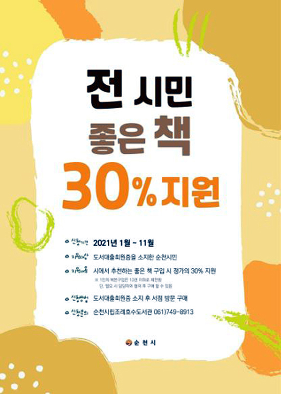 ‘전 시민 좋은 책 도서 지원사업’은 도서대출회원증을 소지한 순천시민을 대상으로 순천시 One City One Book, 시민 추천도서, 전문기관 추천도서 등 순천시가 선정한 좋은 책 구입시 정가의 30%를 지원한다.