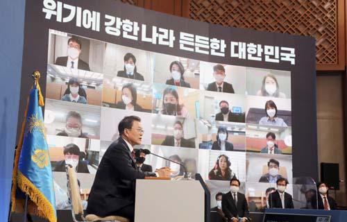문재인 대통령이 18일 오전 청와대 춘추관에서 온·오프 혼합 방식으로 열린 '2021 신년 기자회견'에 참석해 취재진의 질문에 답변하고 있다.