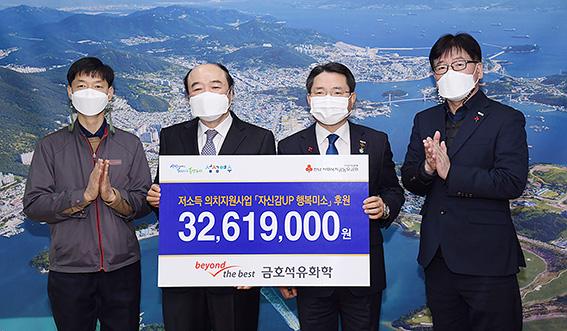 금호석유화학 송석근 부사장이 19일 여수시청 시장실을 방문해 직원들이 급여의 일정금액을 십시일반 모으고 회사가 1:1로 매칭한 모금액 3261만9000원을 권오봉 여수시장에게 전달했다.