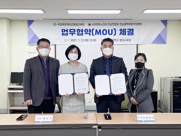 국립목포대학교 평생교육원은 지난 21일 목포대학교 남악캠퍼스에서 (사)대한노인회 목포시지회 노인직업훈련센터, (사)대한노인회 전남연합회 전남광역 취업지원센터와 “노인의 사회참여와 경제활동 지원 및 상호발전”을 위한 업무협약을 체결했다고 밝혔다.
