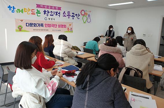 광양시 건강가정·다문화가족지원센터는 다양한 문화에 대한 편견 완화 및 긍정적 인식 제고를 목표로 결혼이민자들이 지역사회에 적응하고 다양한 문화를 소개할 기회를 제공하고자 ‘다문화 인형극단’ 설명회를 가졌다고 24일 밝혔다.