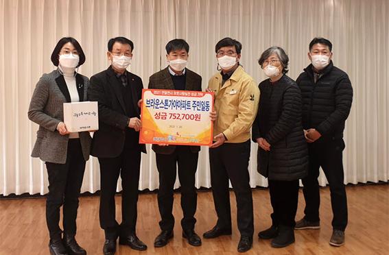 광양시 광영동은 브라운스톤가야 아파트 주민들이 연말연시 어려운 이웃을 위해 이웃사랑 나눔을 실천하고자 성금 752,700원을 전달했다고 25일 밝혔다.