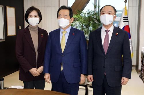 정세균 국무총리와 홍남기 부총리 겸 기획재정부 장관, 유은혜 부총리 겸 교육부 장관이 26일 오전 정부세종청사 총리 집무실에서 열린 총리-부총리 협의회에 앞서 기념촬영을 하고 있다.