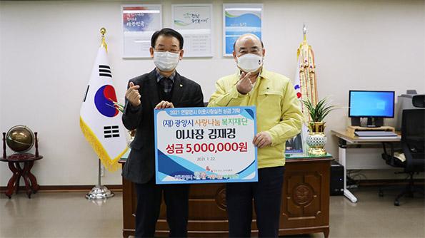 광양시는 김재경 (재)광양시사랑나눔복지재단(이하 복지대단) 이사장이 지역 내 어려운 이웃을 위해 성금 500만 원을 복지재단에 지정기탁했다고 26일 밝혔다.