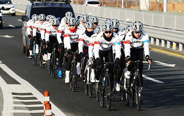 지난 25일부터 전남 강진군에서 전지 훈련에 들어간 사이클 국가대표 상비군 37명의 선수들이 남녀부로 나뉘어 도로훈련을 하고 있다. /강진군 제공