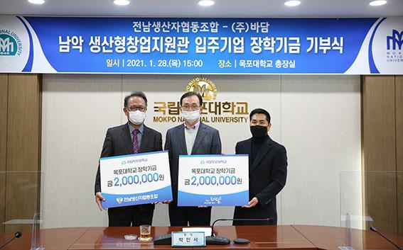 국립목포대학교(총장 박민서)는 지난달 28일 오후 3시 총장실에서 남악캠퍼스 생산형창업지원관 내 창업보육센터 입주기업인 전남생산자협동조합과 ㈜바담의 장학기금 기부식을 개최했다고 밝혔다.