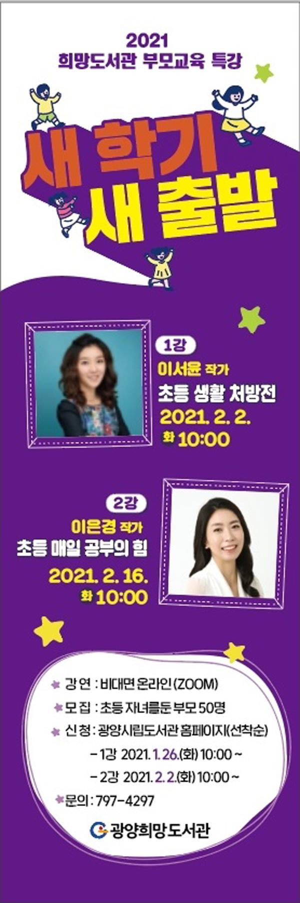 광양희망도서관이 새 학기를 맞아 초등학생 자녀를 둔 부모를 대상으로 오는 2일과 16일 ‘새 학기 새 출발’부모교육을 온라인 생중계(ZOOM 프로그램)로 진행한다고 밝혔다.
