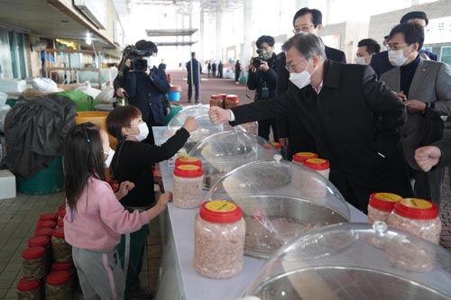 문재인 대통령이 지난 5일 오후 설 연휴 임시개통 예정인 신안군 임자2대교에서 열린 세계 최대 해상풍력단지 48조원 투자협약식 체결 후 신안젓갈타운을 방문해 상인의 자녀들과 인사하고 있다.