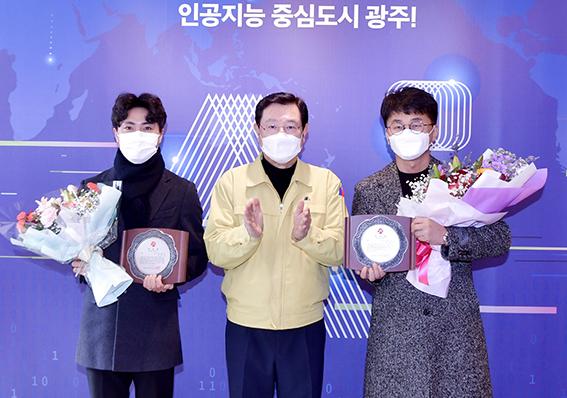이용섭 광주시장(가운데)이 5일 시청 접견실에서 올해 첫 의로운 시민에 선정된 김래준(46)씨와 김보건(30·맨 왼쪽)씨에게 표창패를 수여한 뒤 박수로 감사의 뜻을 전하고 있다. 김래준씨는 개인사정으로 이날 직장 동료 김경남씨가 대리수상했다. (사진=광주시 제공)