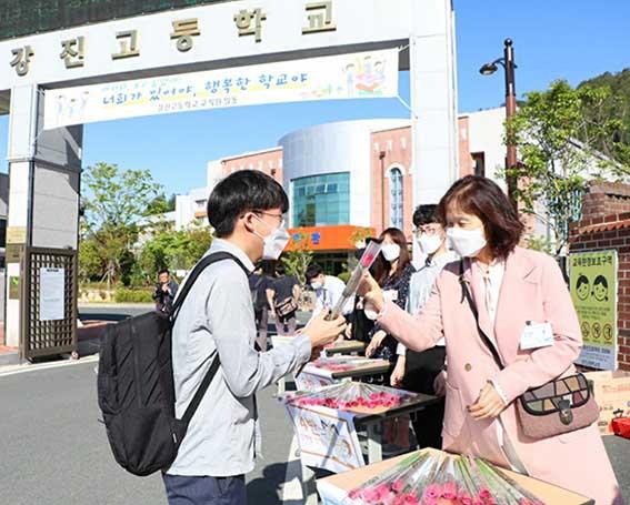 강진고는 작년에도 어려움에 처한 화훼 농가를 돕기 위해 칠량면에 있는 땅심화훼영농조합 법인에서 장미꽃을 구입하여 학생들 등교일이나 각종 기념식 때 전달한 바 있다.