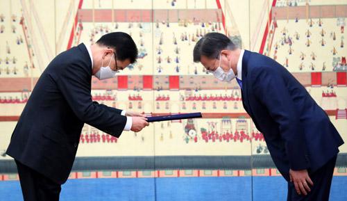 문재인 대통령은 15일 정의용 외교부 장관, 황희 문화체육관광부 장관, 권칠승 중소벤처기업부 장관 등 신임 국무위원들에게 임명장을 수여했다.
