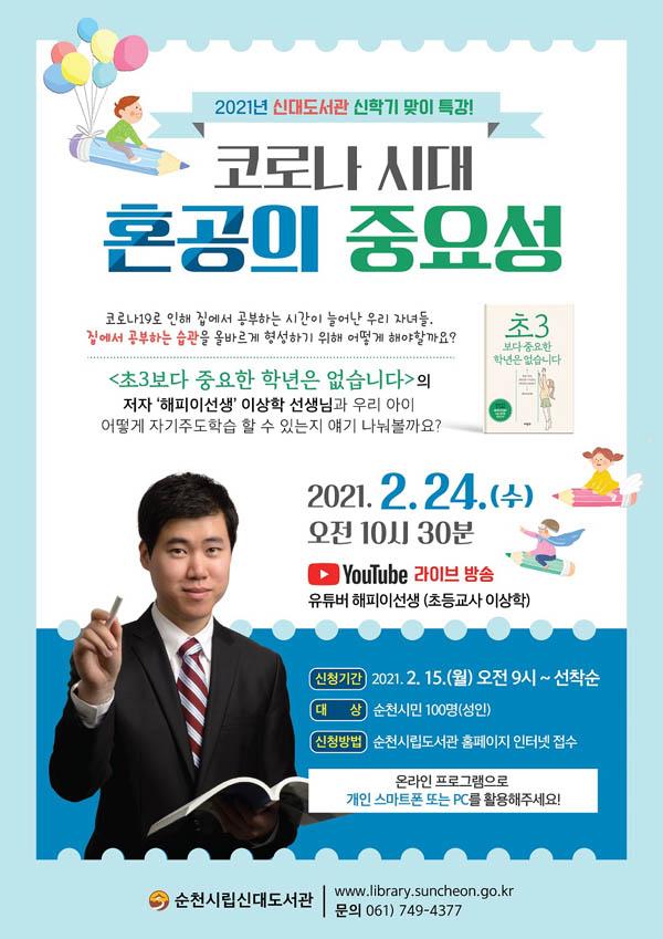순천 신대도서관이 오는 24일 ‘초3보다 중요한 학년은 없습니다’저자 해피이선생(초등교사 이상학)의 신학기 맞이 특강 ‘코로나 시대 혼공의 중요성’을 운영한다.
