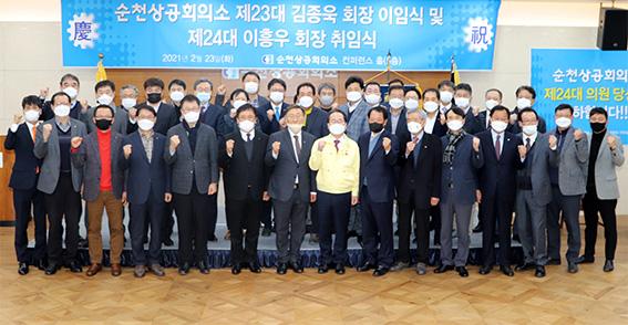 순천상공회의소는 23일 상의회관 5층 컨퍼런스 홀에서 제24대 제1차 임시의원총회를 개최하고, 이흥우 성우종합건설(주) 대표이사를 의원 만장일치로 24대 회장에 추대선임하고 취임했다.