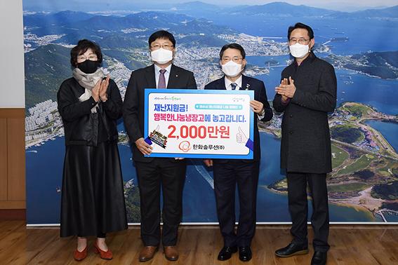25일 여수시에 따르면 한화솔루션 임직원들이 재난지원금 수령액 중 일부를 모금해 마련한 2000만 원의 기부증서를 '행복한 나눔냉장고' 사업을 위해 써달라며 권오봉 여수시장에 전달했다.