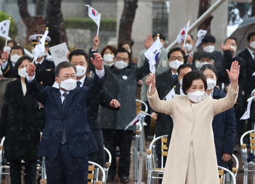문재인 대통령이 1일 오전 서울 종로구 탑골공원에서 열린 제102주년 3·1절 기념식에 참석해 만세삼창을 하고 있다.